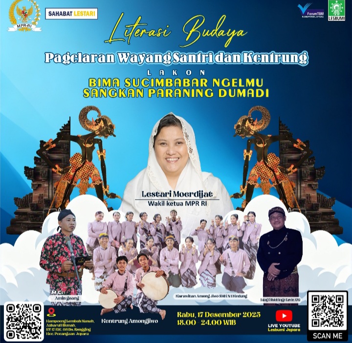 Lumbunginformasi.id Jepara – Upaya penguatan literasi budaya kembali digelar melalui pagelaran seni tradisional wayang santri yang dikolaborasikan dengan musik tradisional kentrung. Kegiatan ini akan berlangsung di Joglo Kampung Lembah Manah, Kecamatan Pecangaan, pada Rabu, 17 Desember 2025.